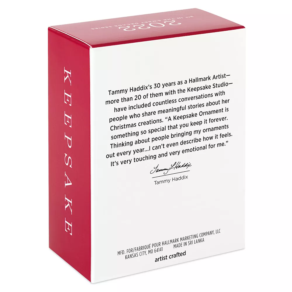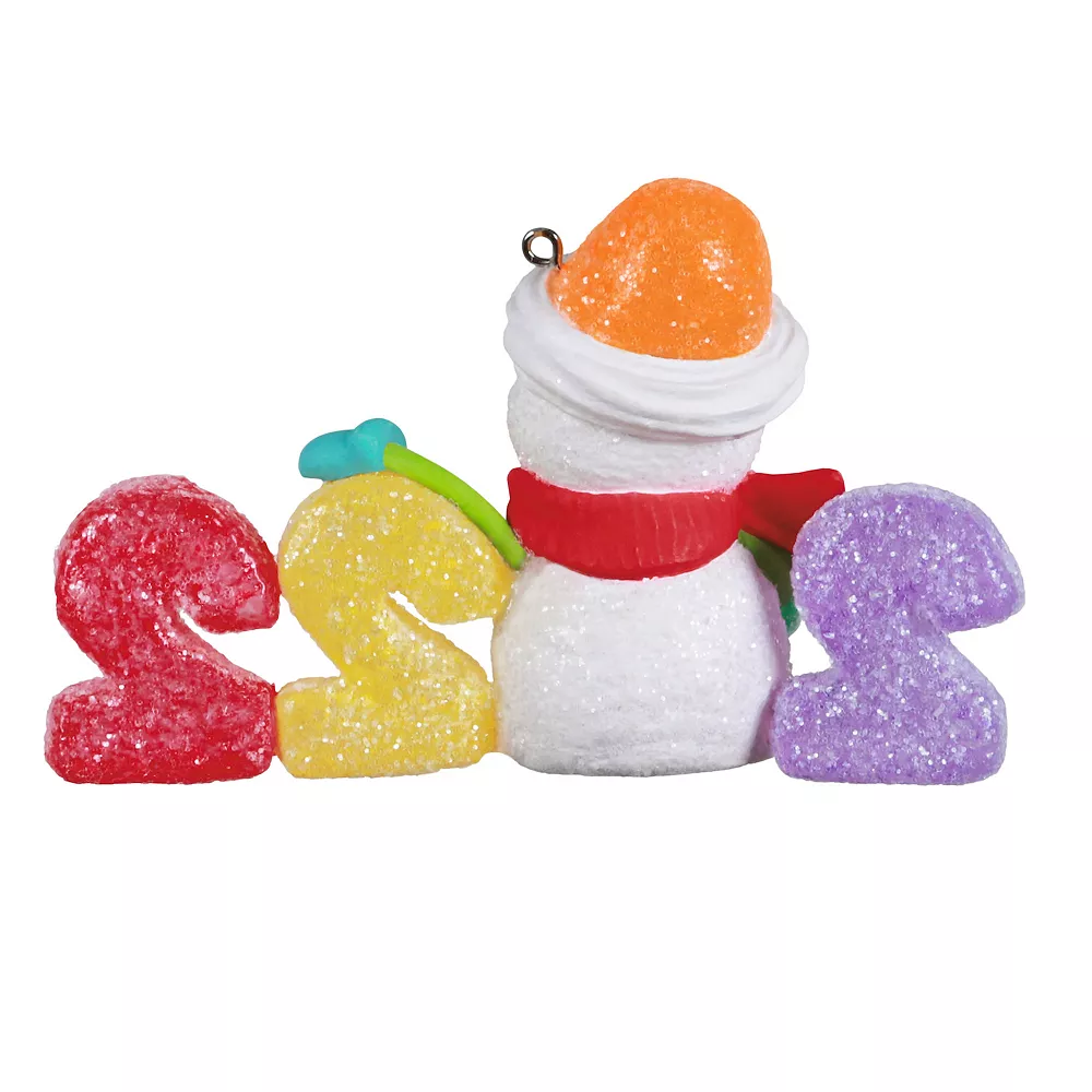 Celebrate a year to remember with this cute Christmas tree ornament. Featuring gumdrop numbers and a glittery snowman holding a wreath in place of the “0” for “2022,” this decoration is perfect for anyone with a sweet tooth.
