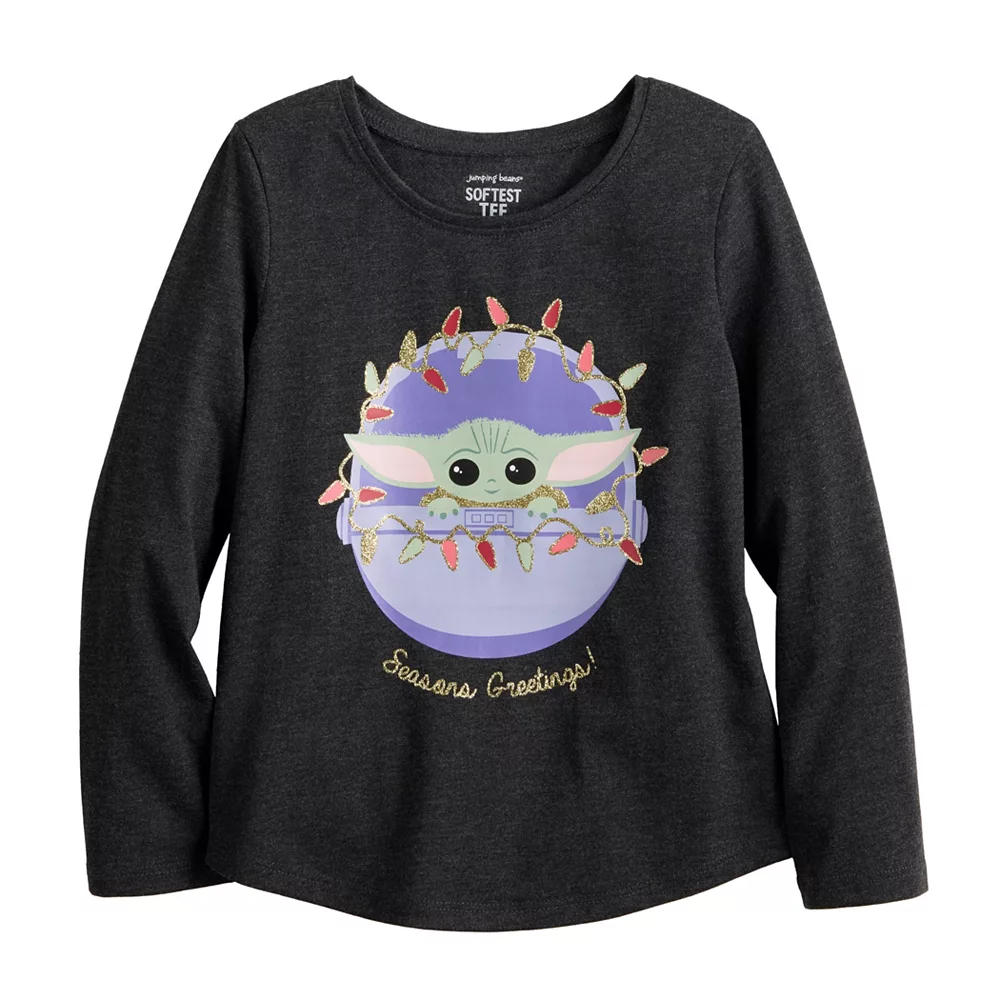 The Force will be with her in this festive girls’ Grogu aka Baby Yoda embellished long sleeve holiday graphic tee from Jumping Beans.